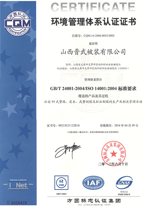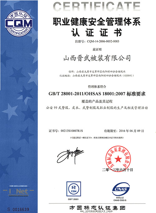 晉武被裝自1999年先后通過了ISO9001、ISO14001和OHS18001認證,并在2009年被獲得了“中國優(yōu)質產品”證書,同時先后從日本、德國、美國引進先進的生產設備和先進的生產工藝,在2011年年初,我公司被評為“質量、服務、信譽AAA級金牌單位”。